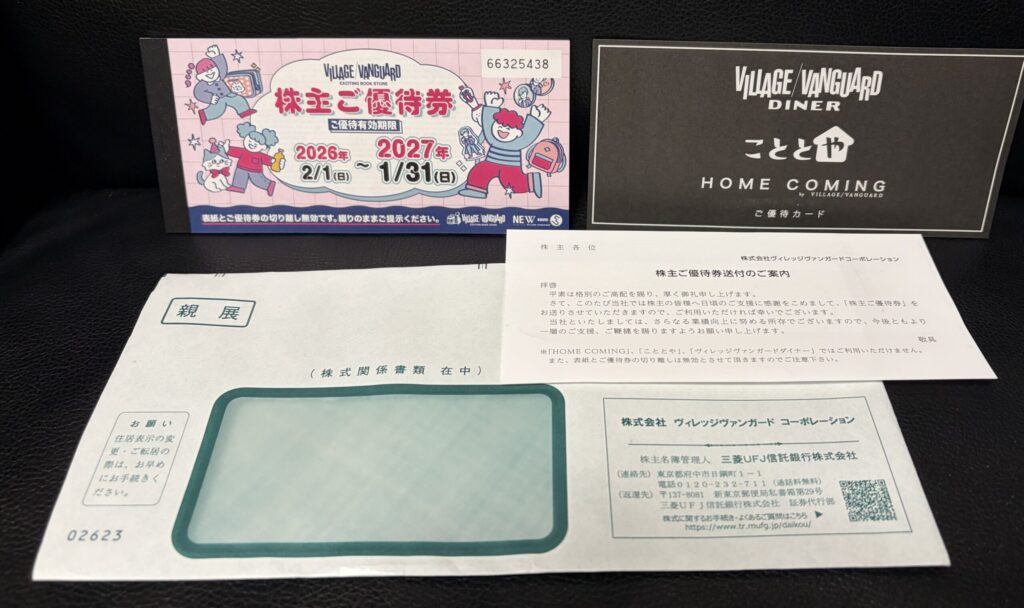 ……今年も来たね。ヴィレッジヴァンガードコーポレーション (2769) の12,000円分優待券。お買い上げ2,000円(税込)ごとに1,000円券が1枚使えるスタイルだから、組み合わせ次第では、体感的にかなりお得に使える仕組みだね。何を買えばいいんだろう。光る泥団子キットとか?
