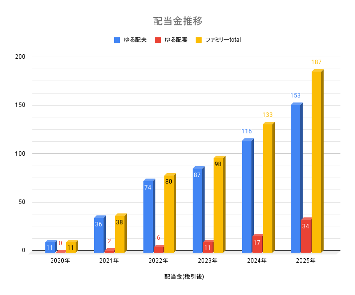 - 2025年: 年間配当約187万円(ゆる配ファミリー税引後) 月15.6万円