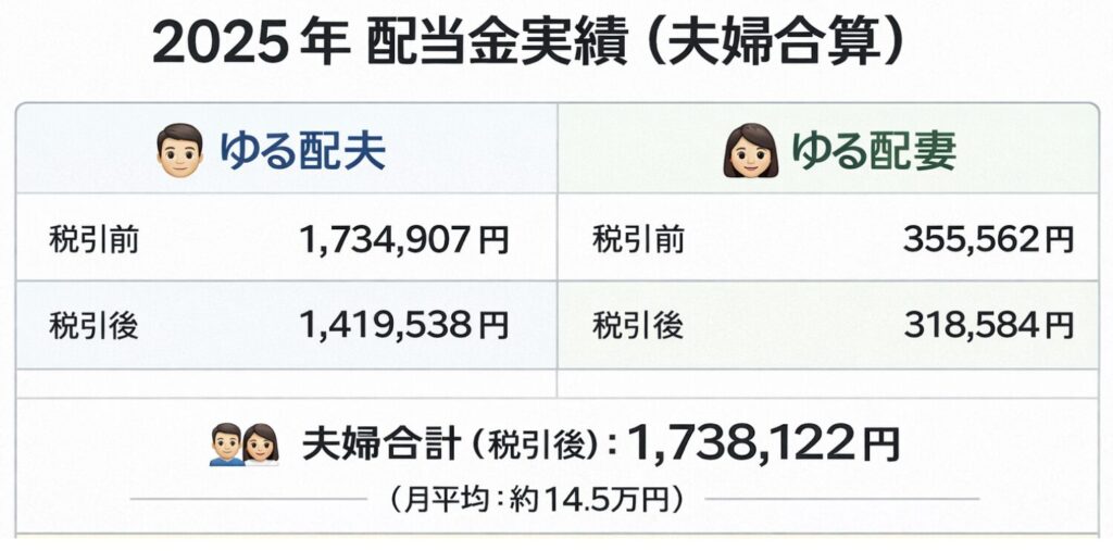 夫婦合計の税引後配当は約173.8万円。 月平均にすると、およそ14万5,000円くらいのイメージです。